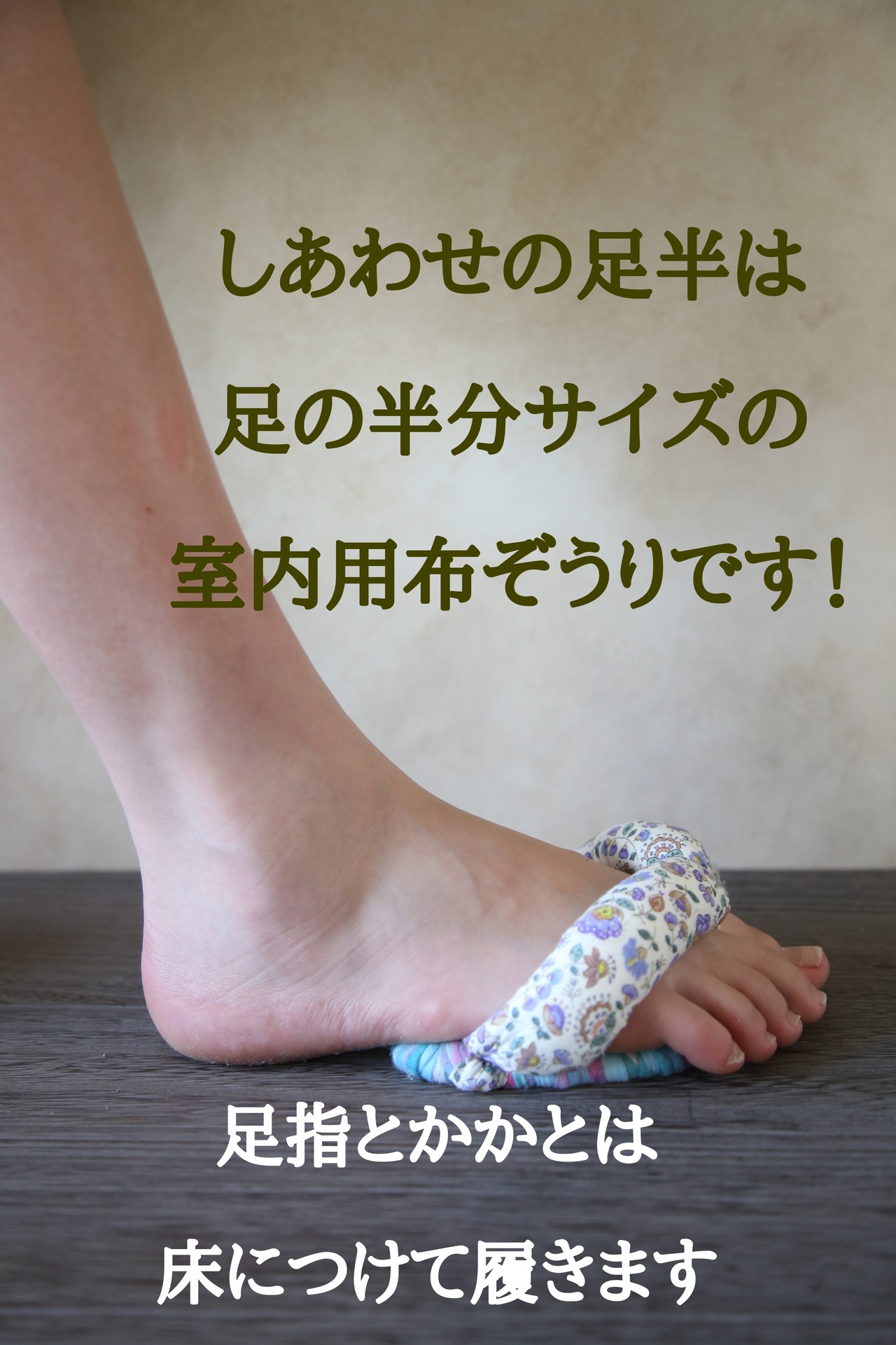 O脚・冷え性・姿勢の悪さなど色んな悩みがあった私が怪我をきっかけに足半に出会い、治らないと思ってたO脚が冷え性が姿勢が…他にも色んないい事が起こった感動、幸せに感じたことを皆様にもお伝えしたく、『しあわせの足半』と名づけ販売させていただくことにしました。